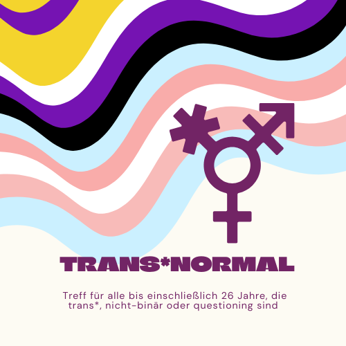 Trans*normal ist ein Teil des Freitagstreffs und wird überwiegend von jungen trans* Personen moderiert. In einem geschützten Rahmen gibt es Raum zum gemeinsamen Austausch: Ihr könnt Fragen oder Themen mitbringen. Ihr könnt auch einfach nur dabeisitzen.
